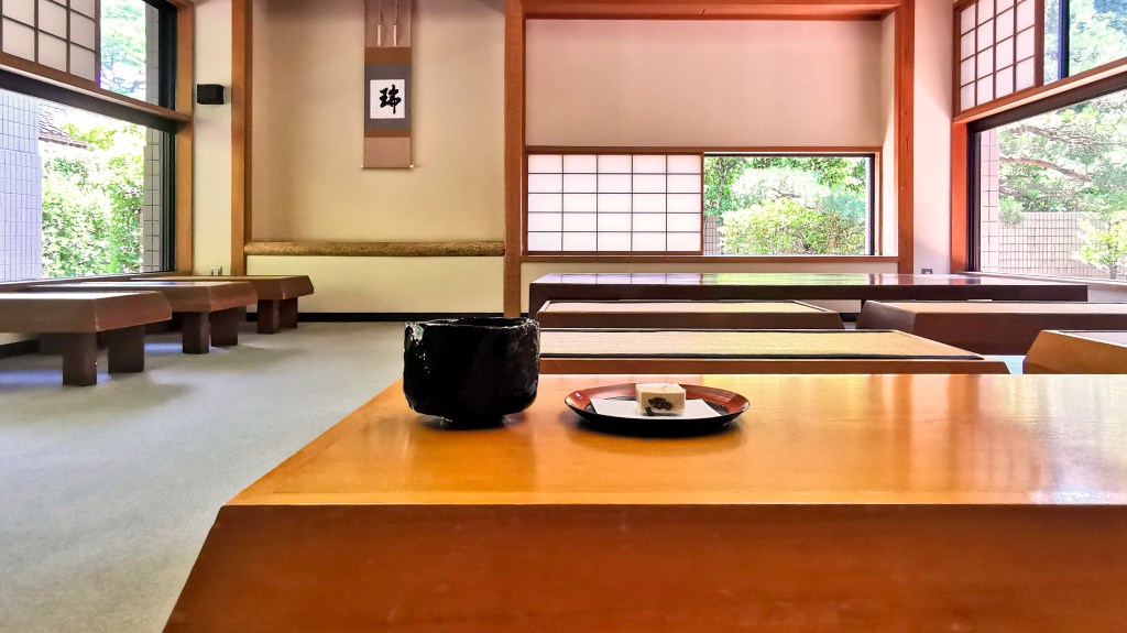 It’s not a real tea ceremony but I try to drink the masha as it should. First eat the pastry that is served with the tea, cut it into smaller pieces if it is accompanied by a utensil for this purpose. Take the bowl with your right hand and place it in the palm of your left hand. Turn the bowl twice a quarter turn with your right hand so you don’t drink from the side where the bowl was presented to you. Drink gently the green liquid a little frothy that looks like a pastry because it seems solid; it is slightly bitter, the temperature is perfect. After drinking, turn the bowl twice in the opposite direction and gently place it on the wooden table.
