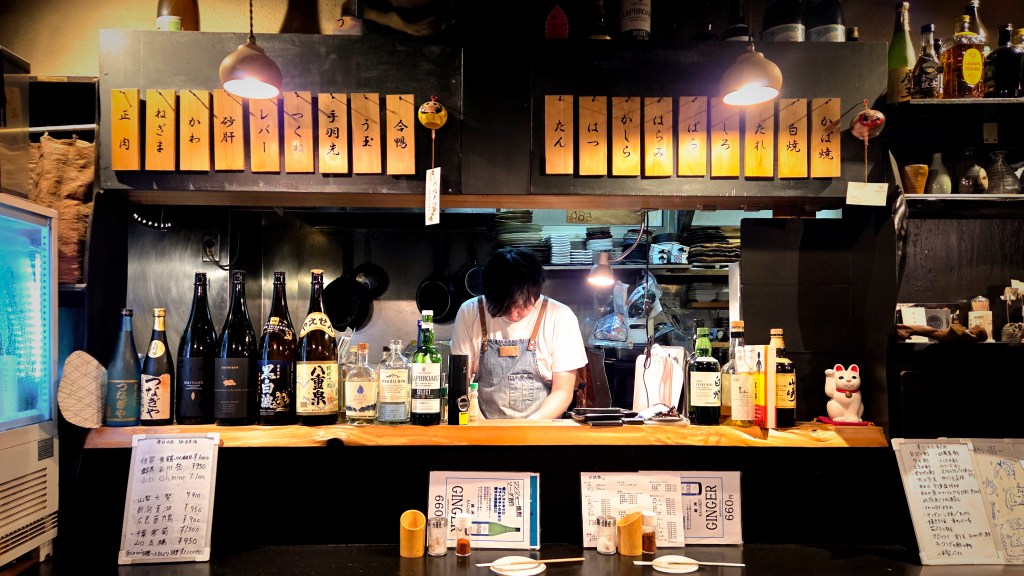 It’s time to meet Takashi, time to go eat at one of those izakayas he has a gift for discovering, places I probably wouldn’t be able to enter without him. It takes a little over half an hour by subway to reach Musashi-Koyama and walk to Tsunagiya, where my friend is waiting. A few small tables and a counter behind which the chef prepares yakitoris and sashimis.