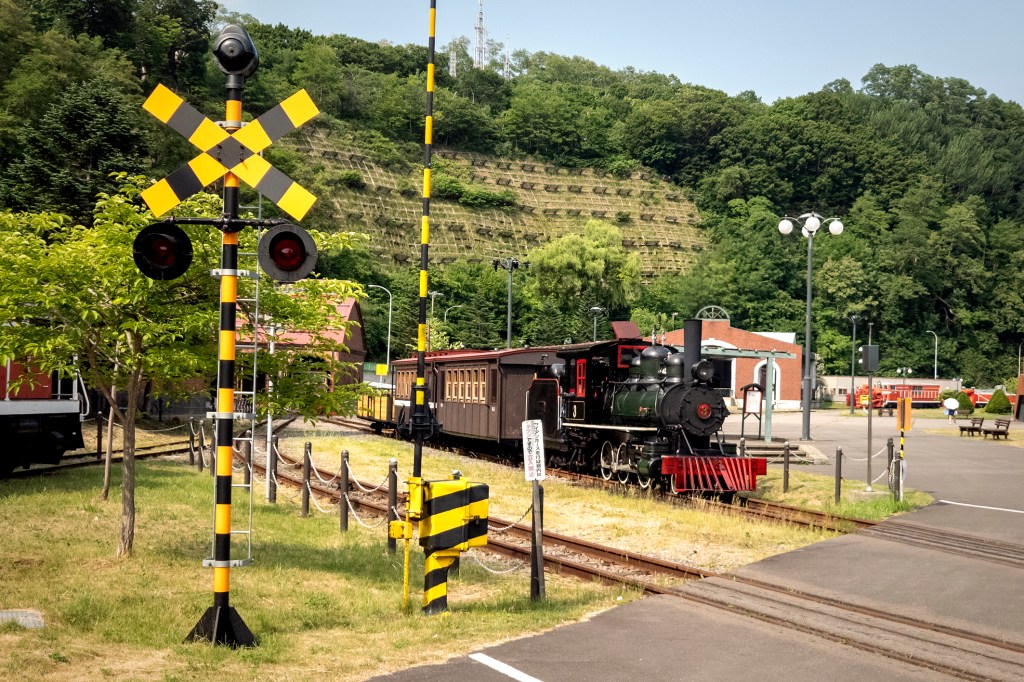 At the end of the track is a full-scale museum where a variety of locomotives and carriages from different eras lie in peace, showcasing their bygone power. They’ve had their day, not all are in good shape, but one still huffs and puffs smoke while nearby two workers in period costume bustle about, polishing it to a gleaming shine. Visitors can ride in vintage carriages pulled by this old engine. The ride ends on a 転車台 that allows the locomotive to turn around.