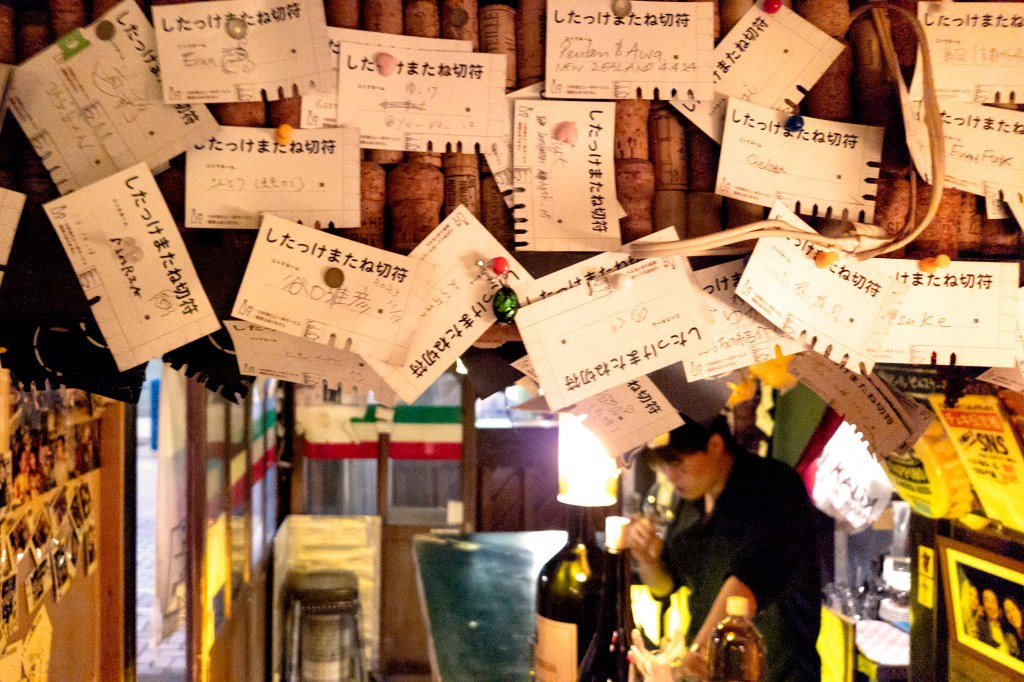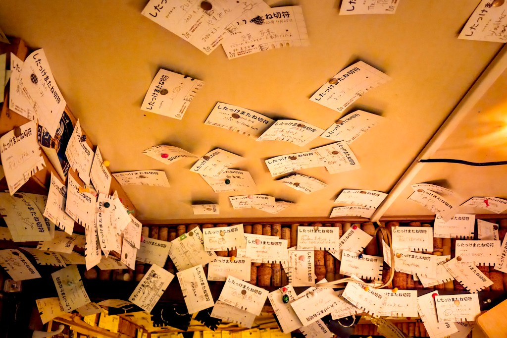Buona sera is a place of passage and encounters — it lives up to the name Otaru’s regulars have given it. On the walls, on the ceiling, on the beams — everywhere — small cards the size of business cards are pinned in a charming and friendly anarchy. Printed on the paper in bold Japanese script: したっけまたね切符, “Goodbye See-You Ticket.”