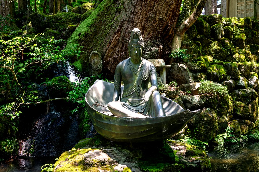 At the foot of the stairs leading to the temple entrance, beside the dragons for purifying one’s hands, stands a curious statue. The goddess of compassion, Kannon, carried by a leaf, recalls one of her apparitions to Master Dōgen himself. She came to him during the journey he made to China at 23 years old, seeking an answer to a theological question that haunted him: “If all beings possess the Buddha-nature, why practice?” He discovered in the Caodong school the pure zazen taught by Master Rujing—a meditation without technique, without object, without goal. Just sitting. For him, everything became clear—this demanding practice became the foundation of his Zen: meditation is not the means to awakening—it is awakening itself.