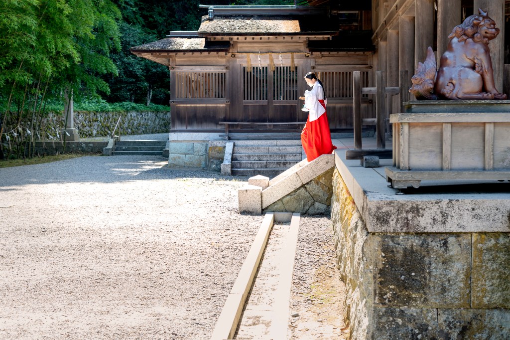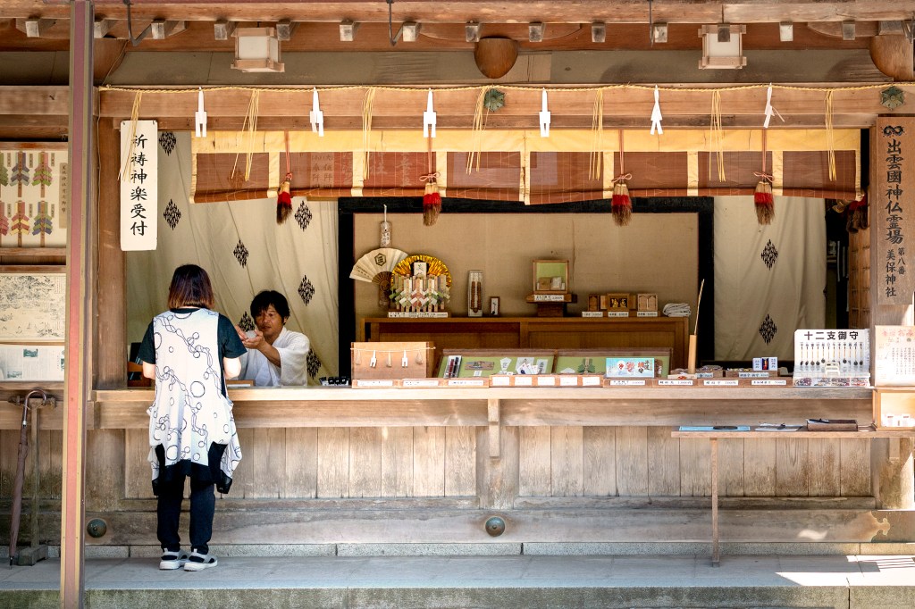Leaving through the torii marking the entrance, I see to the left a cobbled street lined with wooden houses; it seems from another time. This is Miho no Sando, the shrine road. Legend says that since the 9th century, sailors stopped at the port and took this path to pray to Ebisu. It is also said that the gods themselves walked this road. It is a strange place, dizzyingly calm in contrast to the intensity of the cicadas. Nothing happens, or rather, nothing passes except the teasing brush of a sea god.