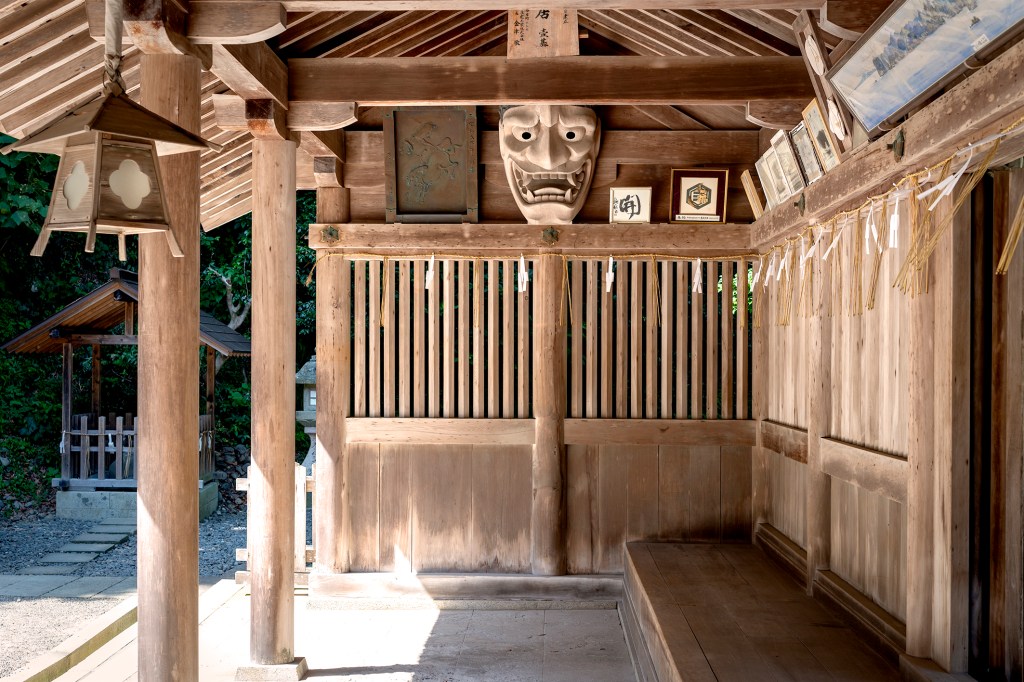 I like to lose myself in such places, visited only by a few vacationing Japanese who come to make a wish or show their children a place of cultural meaning. The heat encourages calm, the sun beats down. Cicadas resonate in waves, seeming to intensify their buzzing as I approach a cluster of trees. I can’t see them, but the sound is so intense it seems to overwhelm everything, even to frighten. Some details catch my eye: a lamp, a demon mask, a pair of sandals, a 狛犬, the shrine guardian, in a posture somewhere between playfulness and aggression.