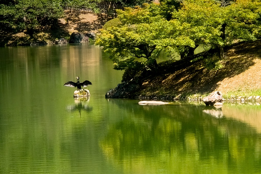 掬月亭 is a teahouse of great beauty. Its origin dates back to 1640; it is located on the edge of the southern pond, opposite Mount Fuji Hill. Even if it is no longer as vast today, its position at the water’s edge makes it a remarkable spot. Open to the pond, I drink suspended matcha tea while a cormorant dries its wings, a lazy boat glides slowly. Its stillness is potential, in harmony with the slow rustle of wind over water. It lays an indigo blue cloth over the dragon’s skin, which sometimes seems to shiver, tickled by the tiny foam flowing along the flat bottom. Or perhaps it is the long pole slowly dipping into the water that comes to gently tease the rough skin between the ribs. Never leaving again becomes an option, unfounded perhaps, but a dream has no time limit.