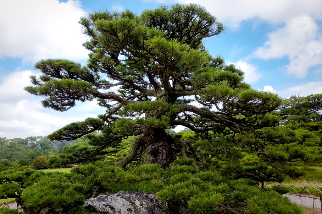 What makes Ritsurin unique, what gives it its beauty and attracts the Japanese, are the pines. There are more than 1,400 of them, many of them over a hundred years old, and a good thousand are regularly pruned by hand, sometimes shaped to grow in a certain way. A traditional pruning technique in Japanese gardens. In Japanese tradition, 松 are a symbol of strength for the samurai. They are found in the gardens of all preserved samurai houses and very often in more modern private gardens. The most famous pine in the park is the 根上り五葉松: originally a bonsai offered to the local lord, it was replanted in open ground around 1830; since then, it has grown freely. This pine is several centuries old and of striking beauty. Its current immensity still retains the form of the bonsai it once was.