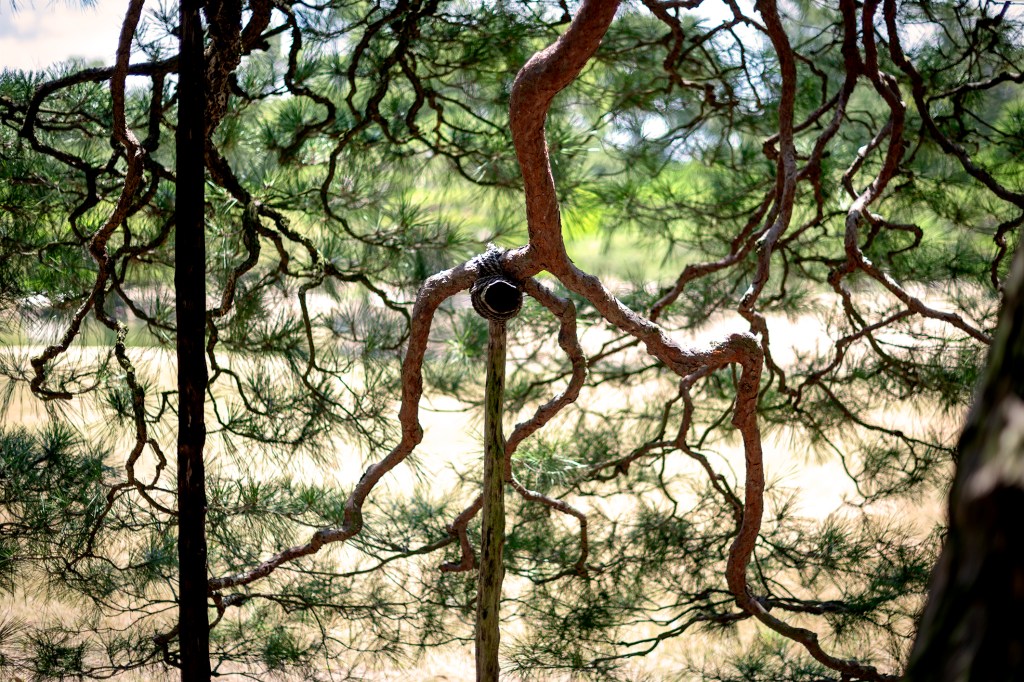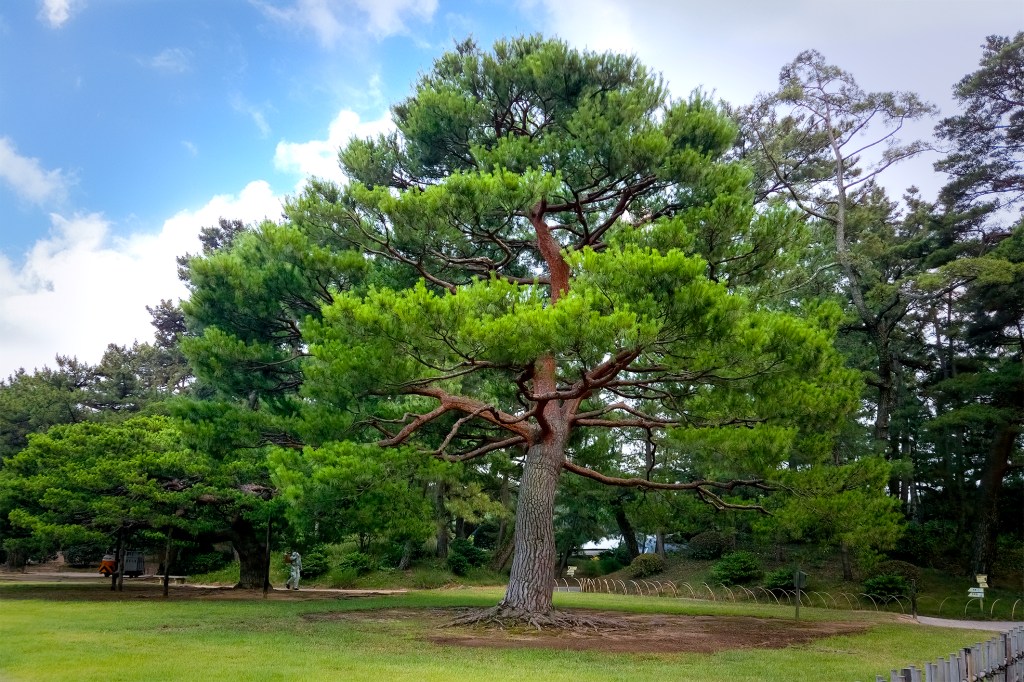 Three species of pines are found in the park: 黒松 (kuromatsu), 赤松 (akamatsu), and 五葉松 (goyōmatsu). Some are shaped like cranes or turtles; others have fused into a single trunk; still others form strange galleries shaped by the gardeners. In a Japanese garden, the hand of man is everywhere, yet it must not be seen, which radically distinguishes it from Western gardens. The beauty of nature is enhanced by the gardeners; they withdraw, hide, and vanish, simply letting the symmetrical asymmetry of life express itself. The gardener acts as a revealer rather than a creator; he does not invent, he knows the techniques, the cuts, the pruning, the orientations, and allows the art to exist.