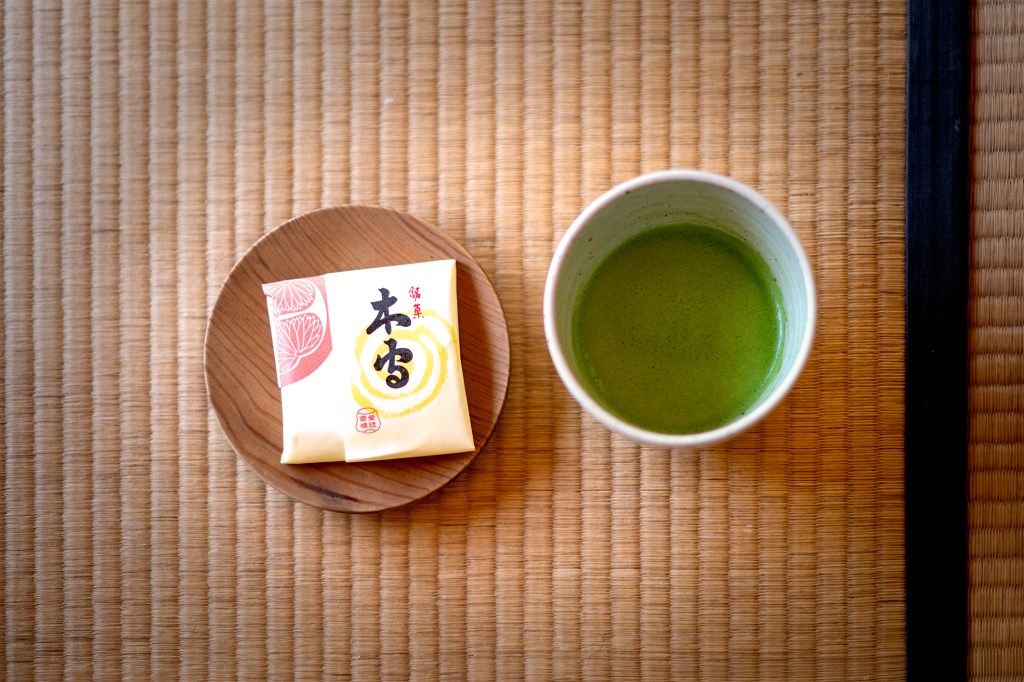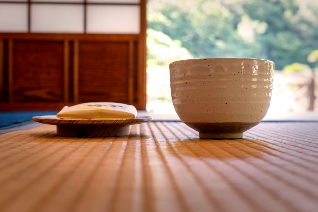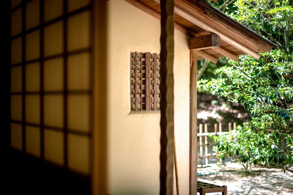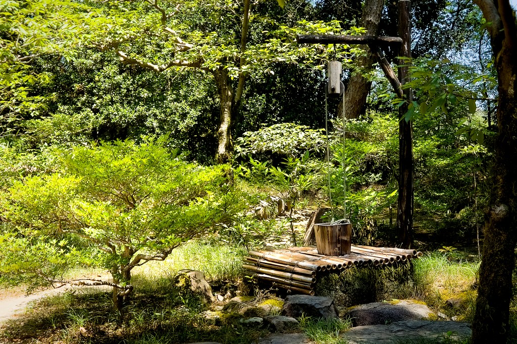 There are so many paths, so many possible routes in Ritsurin that it is not difficult to find a side path and double back to change one’s perspective. I discover another teahouse that will be my delight, 日暮亭. Its name is fitting, suggesting that the place is so pleasant one could stay from dawn to dusk. A morning matcha is in order, served hot or cold according to one’s taste. The place is very different from the house with 128 panels. Here, nothing is sumptuous; everything is delicate and discreet, in constant contrast with the green luxuriance of the small garden. A well gradually appears among the thickets when the eye lingers. One must wait to see; slowly, the simplicity of all things grows and becomes an object of attention, sometimes of questioning. The asymmetrical symmetry is there, it is everywhere. The bowl, the tea, a window, the framing of a space between house and garden, the slightly wild branches around the well. Time has stopped. I understand — this is the dragon’s heart. Very slowly it beats its rhythm and propels the green blood of life.
