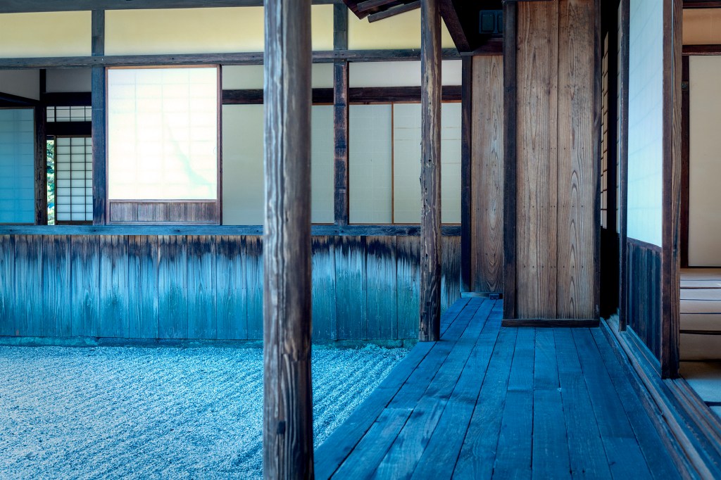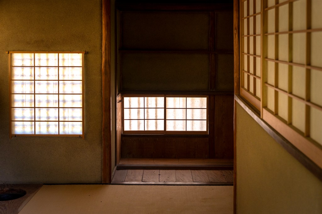 When the sun slowly sinks behind the hills, the teahouse closes like a flower for the night. Its petals are 128 wooden panels, hidden somewhere during the day. They are slid into wooden rails by women in sumptuous kimonos. It is a spectacle of gliding — that of wood rubbing against wood, that of white tabis sliding across the floor, that of fabrics rustling, opening, and closing. At every corner of the house, whose layout is complex, ingenious wooden pivots allow the panels to turn at right angles. The house clothes itself in scales, darkens, wraps itself in a new mystery. Is it part of the dragon?