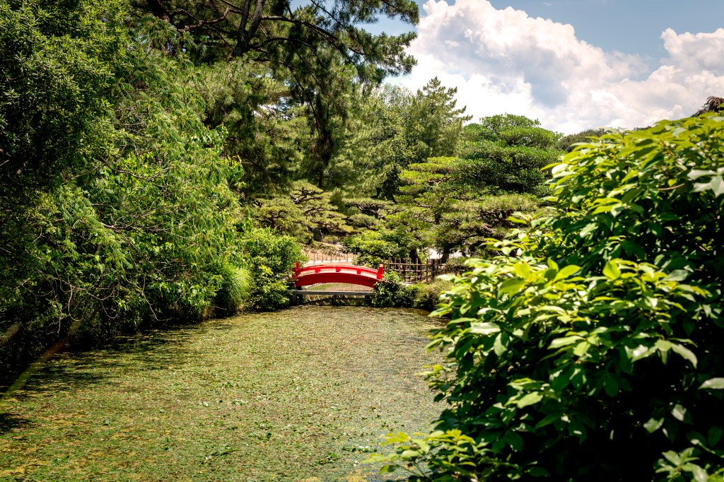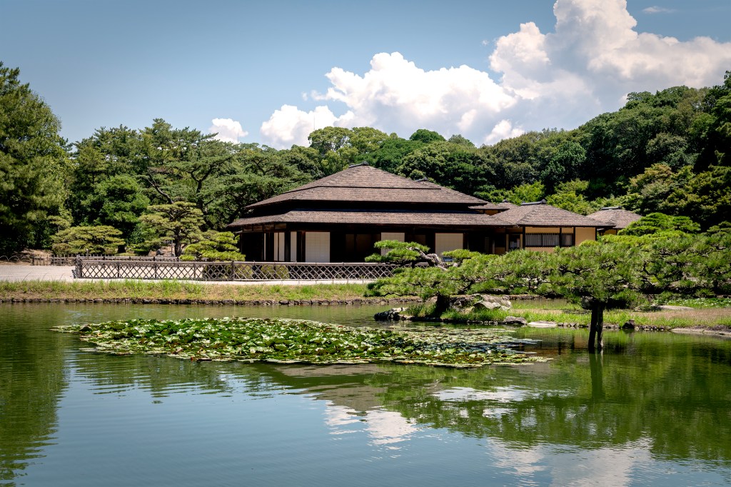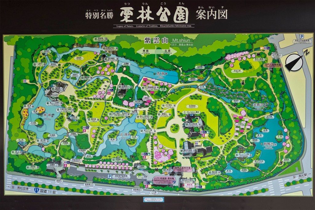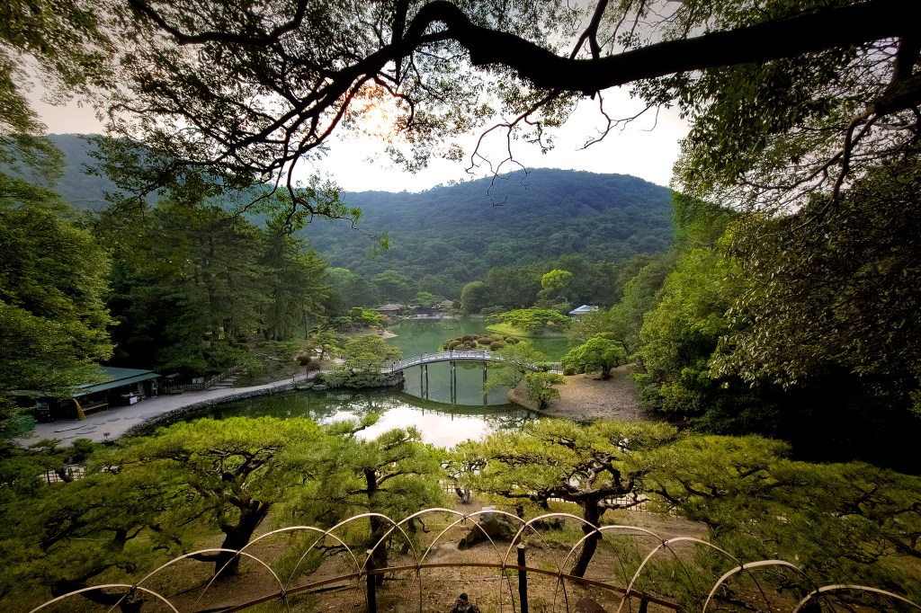 The garden covers 75 hectares; it backs onto Mount Shiun, a magnificent natural backdrop. The southern part is the oldest; it is in the Edo style and was initiated in 1625 by the daimyō Ikoma Takatoshi. It would then serve as a residence for over two hundred years for the Matsudaira clan, to whom Takamatsu had been given by the shōgun Tokugawa; logically, it is the same clan. When the Tokugawa shogunate was overthrown in 1868, the garden was handed over to the Meiji government, which opened it to the public in 1875. The entire northern part of the garden dates from the Meiji era and was designed according to criteria similar to those of a Western botanical garden. Since 1953, Ritsurin Kōen has held the title of 特別名勝.