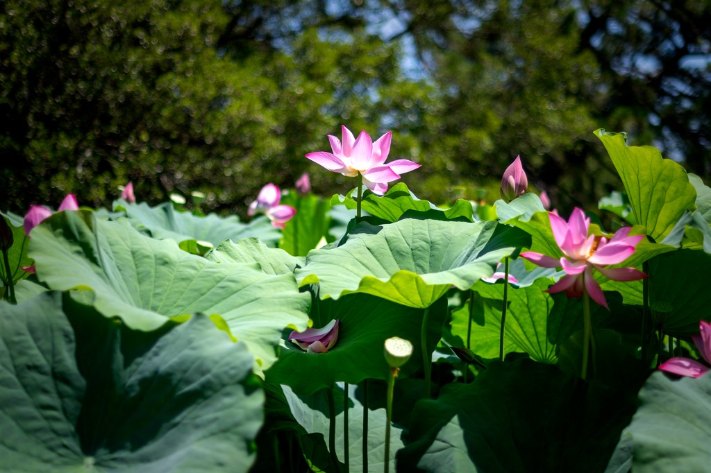 In the northern part, there are carpets of water lilies. They sway on the water, pushed by the wind, still open sometimes when the sun is high. There are forests of lotus emerging from the mud. They spread their majestic circular leaves and allow a few flowers to rise in summer. A symbol of Buddhist awakening, the lotus flower is born from black, sticky water, grows in a uniform canopy, emerges, and blooms in all its beauty, under the sun precisely. Once awakened, its long petals let themselves be caressed by the playful wind, initiating a dance of veils. The heart hides and reveals itself to the rhythm of the warm breath; it plays, it lives, so do I.